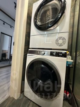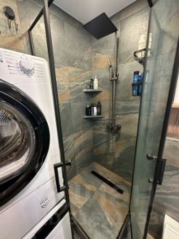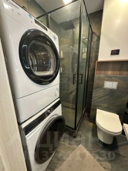 Санузел с душевой кабиной, стиральной машиной, сушкой и водонагревателем.