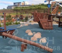 Детская площадка огорожена, на ней расположено новое современное оборудование, плюс шезлонги, столики, стол для настольного тенниса.