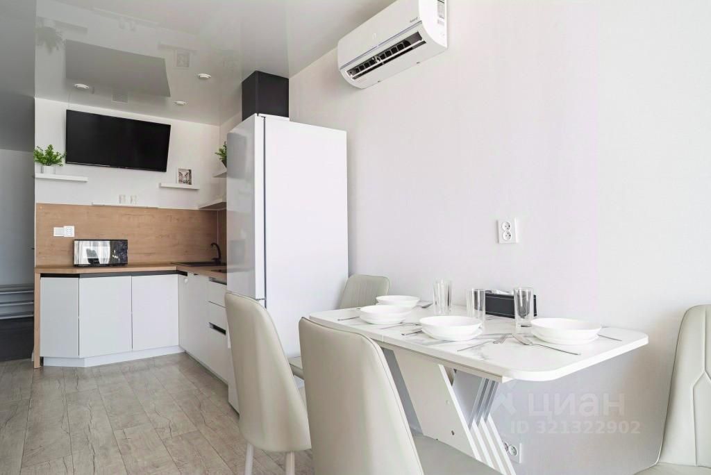 Двухкомнатная квартира включает две спальни и гостиную, совмещённую с кухней. Из окон открывается вид на море.