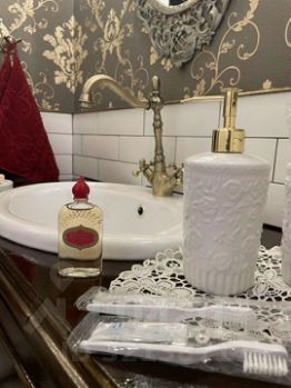 Отдельно хотелось бы сказать о туалетном пространстве с его красивой зоной для умывания, раздельной зоной туалета и ванной зоны в классическом стиле. Все зоны раздельные, что очень удобно при размещений нескольких гостей.