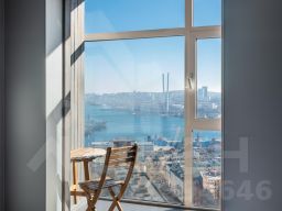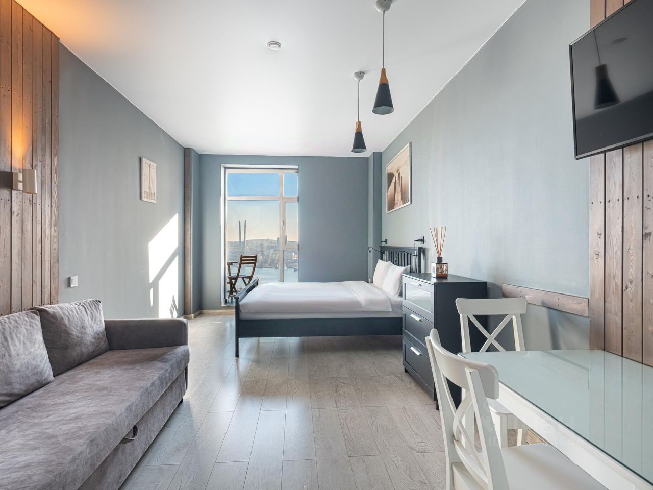 Апартаменты с балконом и панорамным видом на бухту Золотой Рог и мосты располагаются на 17 этаже в современном высотном здании в центре города.