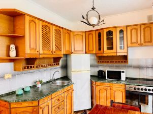 Полностью оборудованная кухня с посудой для приготовления и приёма пищи, холодильником, плитой и электрочайником;