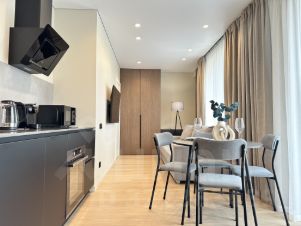 Квартира выполнена в дизайнерском стиле, что подчеркнет вашу индивидуальность. В комнате есть вся необходимая мебель для комфортного проживания. Кухня оборудована современной техникой: кондиционер, холодильник, посудомоечная машина и телевизор. Ванная комната с ванной и стиральной машиной обеспечит удобство в повседневной жизни.