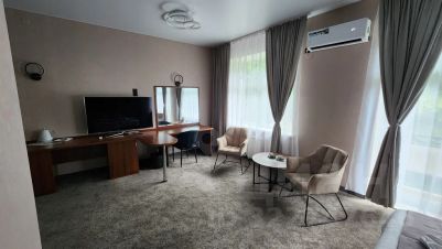 Комфортабельный просторный номер для двоих, отличающийся большей площадью жилой и ванной комнат. В номере только закончен ремонт, современный интерьер. В нем есть все что нужно и для полноценного отдыха и для работы. Белоснежное постельное белье и полотенца, мягкие подушки и теплое одеяло, удобное рабочее пространство. Номер оснащен кондиционером, большим телевизором, холодильником и чайником. К вашим услугам беспроводной интернет и телефонная связь. В номере отдельный санузел большой площади, а также выход на открытый балкон.