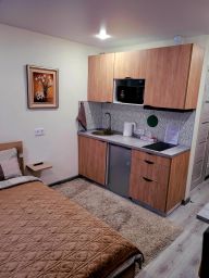 Полностью оборудована кухонная зона мебелью и посудой. На кухне имеются салфетки, средство для мытья посуды)