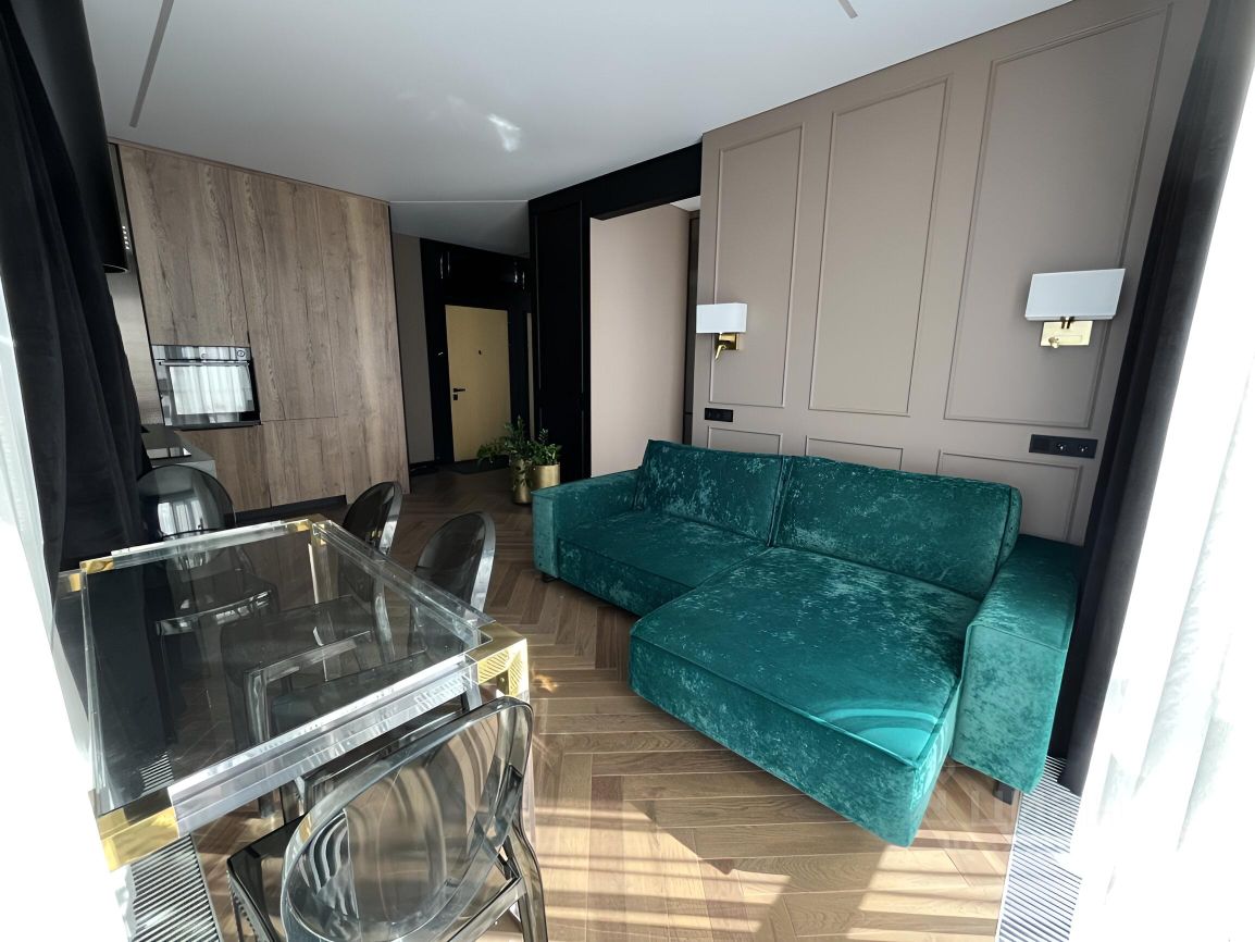 Это стильная современная квартира, с комфортным динамичным интерьером с просторной кухней-гостиной, соединенных в единое пространство.