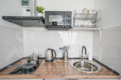 - Кухонная зона со всем необходимым: холодильник, микроволновая печь, электрическая плита, электрочайник, посуда и кухонная утварь