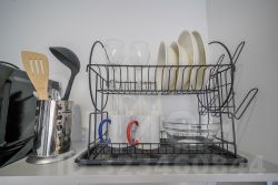 - Кухонная зона со всем необходимым: холодильник, микроволновая печь, электрическая плита, электрочайник, посуда и кухонная утварь
