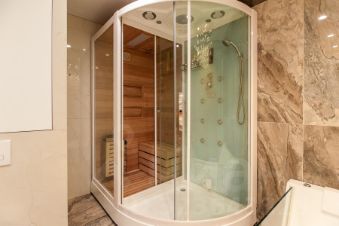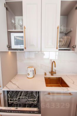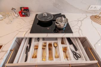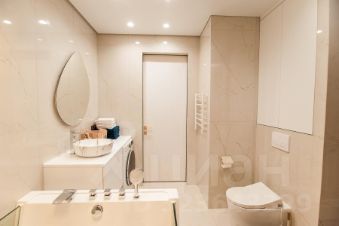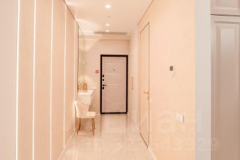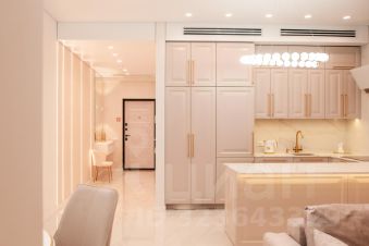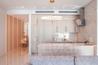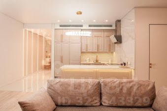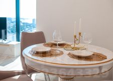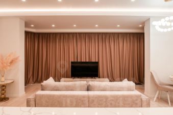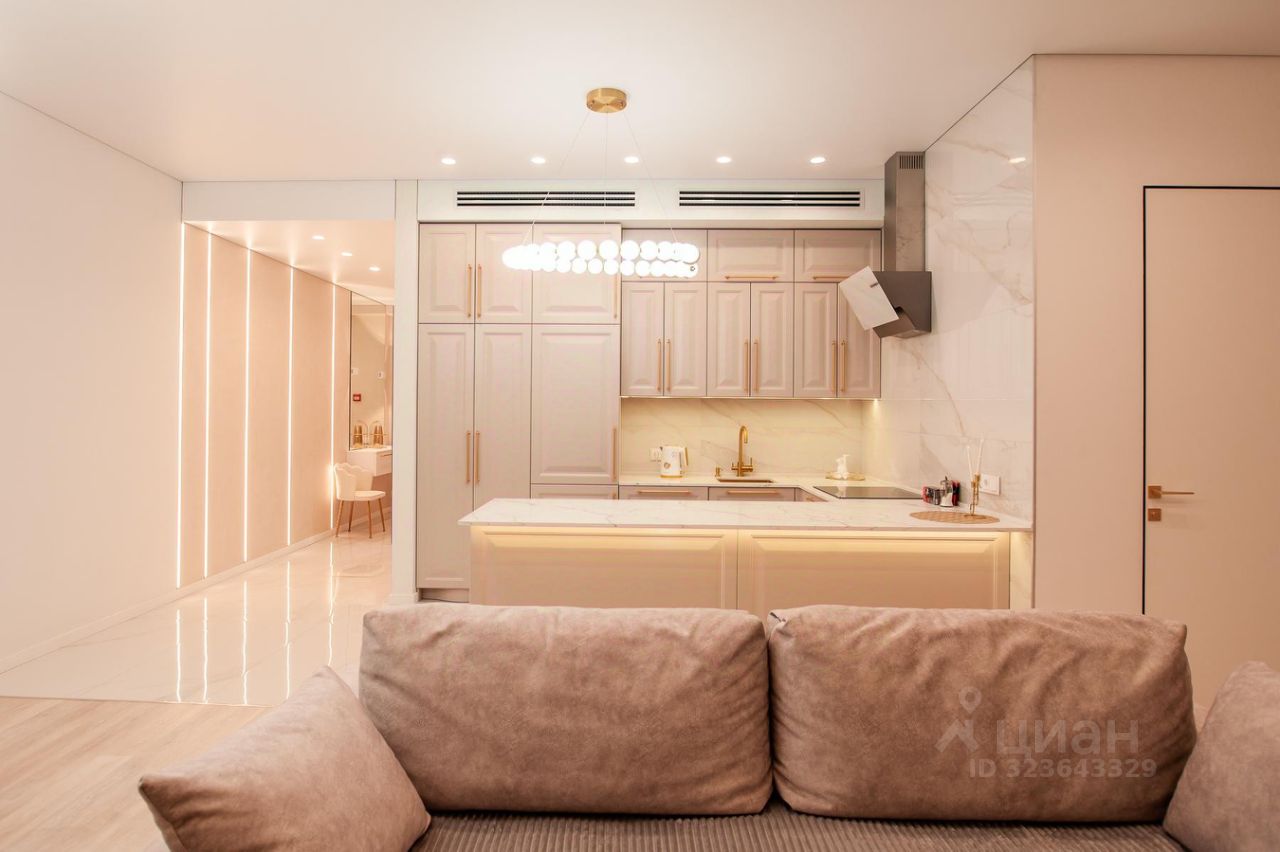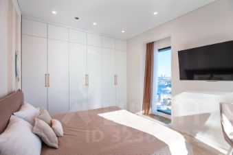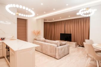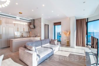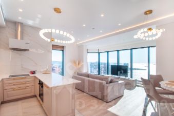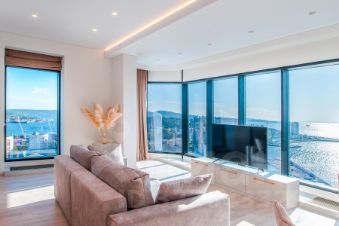 В квартире современный лаконичный дизайн и огромные панорамные окна с завораживающим видом.
