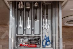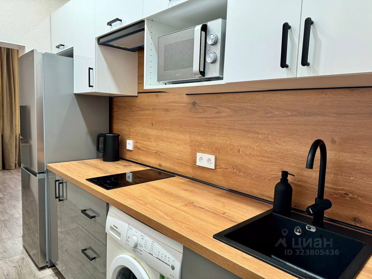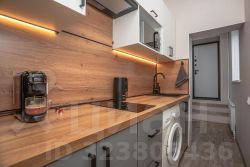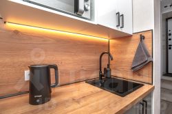 - полное кухонное оснащение: посуда, фильтр для воды, чайник, микроволновая печь, холодильник, варочная панель, вытяжка