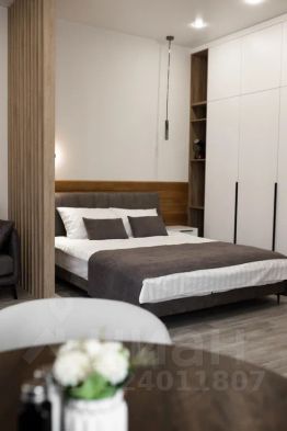 В спальной зоне 2х-спальная кровать, большой шкаф для одежды.
