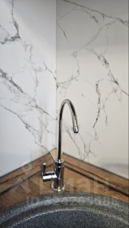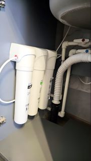 На кухне установлен фильтр для воды, имеется раскладной диван с ящиками для хранения, плита, холодильник, микроволновка, стол, табуреты, кухонный гарнитур.