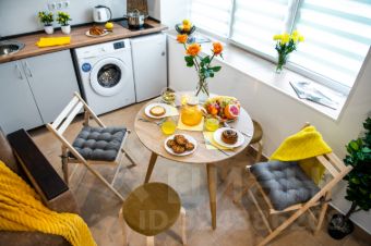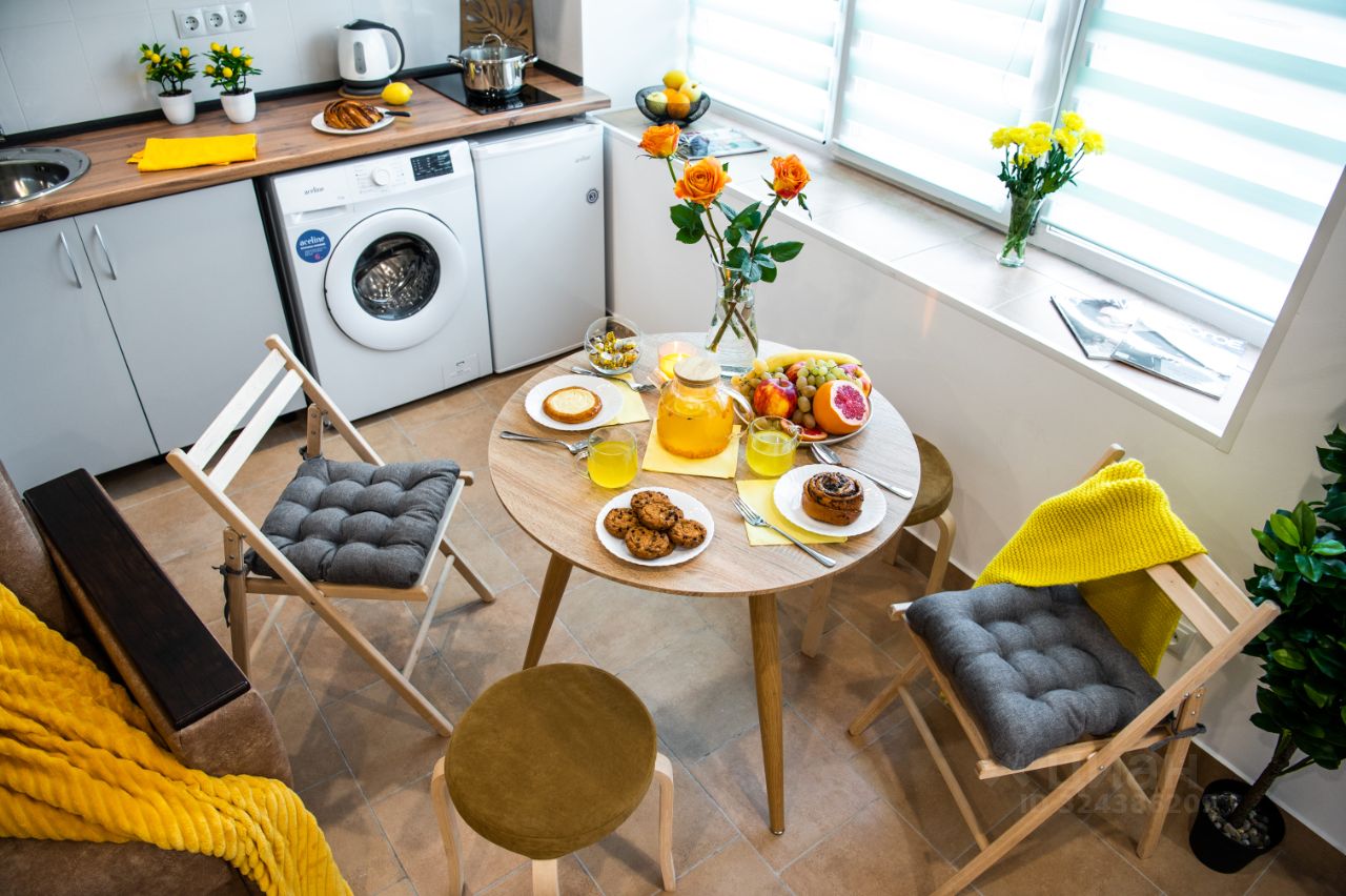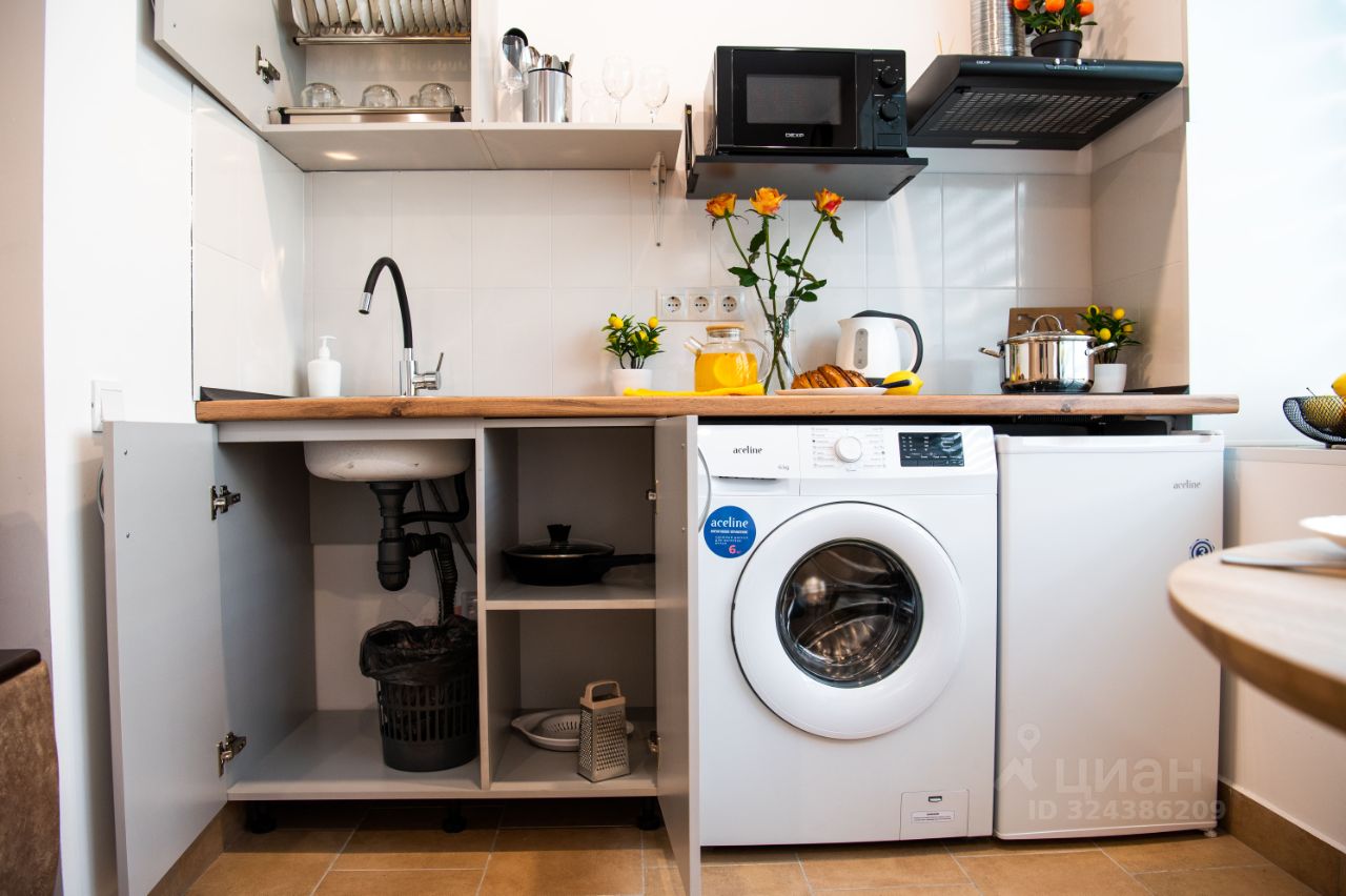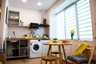 — Полноценная кухня — Холодильник, плита, микроволновка — Электрочайник — Стиральная машина — Посуда и принадлежности — Обеденная зона — Wi-Fi, ТВ