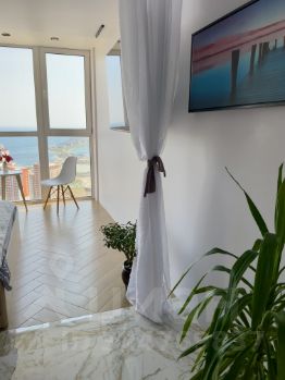 Новая квартира, свеженькая, беленькая и очень уютная с панорамным прекрасным видом на море!!! ? По всей квартире подсветки!, Железная дверь, Натяжной потолок, Межкомнатные двери, Витражные и пластиковые окна, Софиты, Стены выровнены, Тёплый полы по всей квартире!