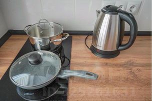 Кухонная зона: холодильник, микроволновка, электрическая плита, чайник, полный набор посуды и кухонная утварь — можно сразу готовить.