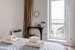 Для комфортного проживания гостей апартаменты оборудованы всем необходимым: 2-спальная кровать, раскладной 2-спальный диван. На балконе расположена кушетка для отдыха, стол и 2 кресла. Имеются все ванно-косметические принадлежности, полотенца, белье, халаты.