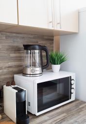 Квартира оснащена всем необходимым для комфортного проживания. В распоряжении гостей двуспальная кровать, кухонный гарнитур, обеденный стол, шкаф-купе и журнальный столик. Бытовая техника включает кондиционер, телевизор, стиральную машину, микроволновую печь, кофемашину и холодильник.