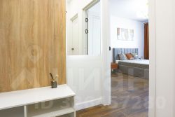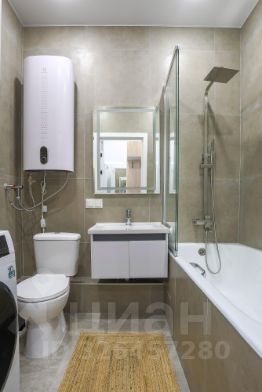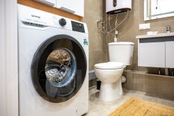 В ванной есть стиральная машина и водонагреватель. Зоны хранения включают в себя большой шкаф и тумбу с выдвижными ящиками. В ванной установлен теплый пол.