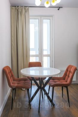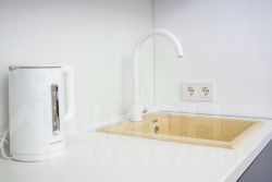 В кухне круглый стол диагональю 80 см и 4 мягких стала, а также духовой шкаф с функцией СВЧ, холодильник, чайник, столовые приборы, комплект ножей и посуды.