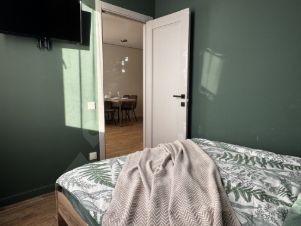 Внутри вас ждёт просторная гостиная с комфортной зоной отдыха, уютная спальня с двуспальной кроватью и анатомическим матрасом, стильная ванная комната с душевой системой и полностью оборудованная кухня — от холодильника и посудомоечной машины до всей необходимой посуды.
