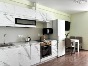 — кухня оборудована современной кофемашиной, которая позволит каждое утро начинать с чашки ароматного кофе. А также всем необходимым для проживания: чайник, микроволновка, большой холодильник, духовой шкаф, индукционная плита, вытяжка и посуда для приготовления и приема пищи.