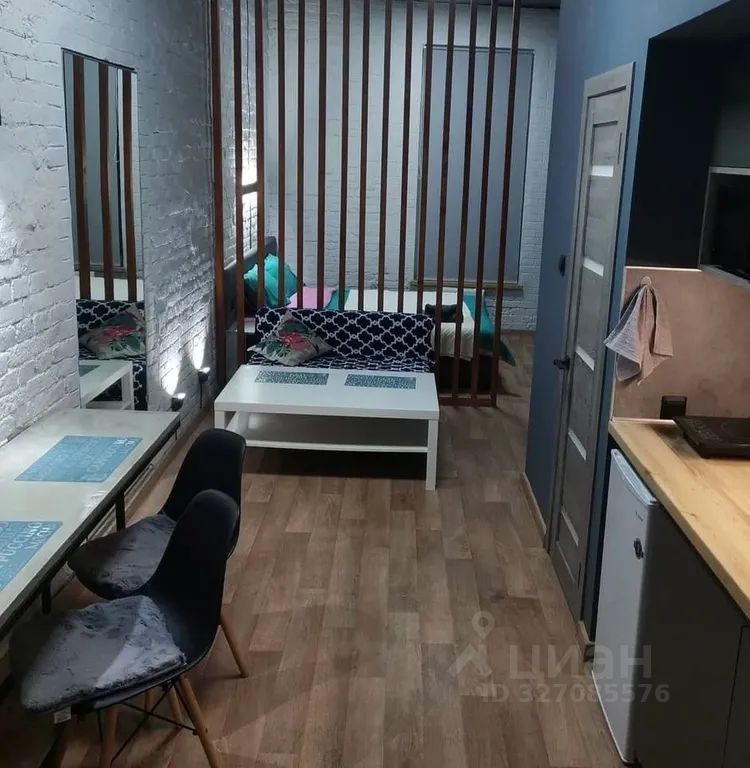 Квартира - студия, включает в себя: спальную, кухонную и гостиную зоны, ванная комната. Гостям предоставляется: 1 чистый комплект постельного белья, 3 полотенца (1 большое и 2 маленьких), шампунь, гель для душа, средства для мытья посуды, мыло для рук, 3 рулона туалетной бумаги, титан на 40л. Стиральной машинки и кондиционера нет!