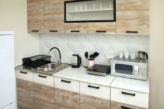 Полностью оборудованная кухня (холодильник, плита, микроволновка, чайник, посуда)