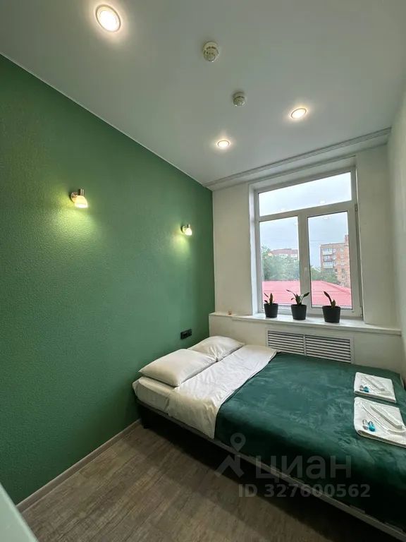 Светлая уютная комната, телевизор, двухместная мягкая кровать, настенное зеркало, напольная вешалка, тумбочка под телевизором, чистое постельное белье и полотенце.