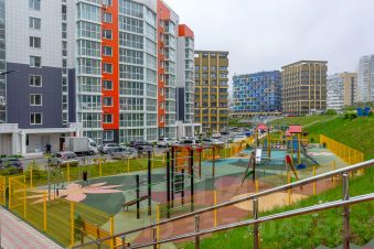 Развязка на выезд из города, в город и на о. Русский. Рядом имеются магазины, супермаркет, кафе и т. д. Автобусная остановка в 5 мин. Прекрасный современный двор, где расположены: спортивная площадка, детская площадка, баскетбольное поле, места отдыха.