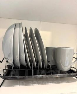-Посуда для приготовления еды, бокалы, столовые приборы, тарелки и даже дуршлаг