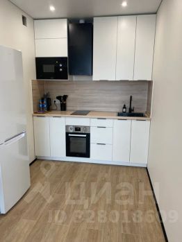 Аккуратная кухня со всей необходимой техникой: холодильник, плита, микроволновка, духовой шкаф, чайник.