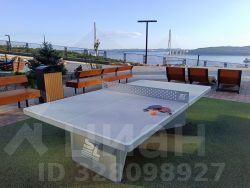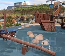 Детская площадка огорожена, на ней расположено новое современное оборудование, плюс шезлонги, столики, стол для настольного тенниса.
