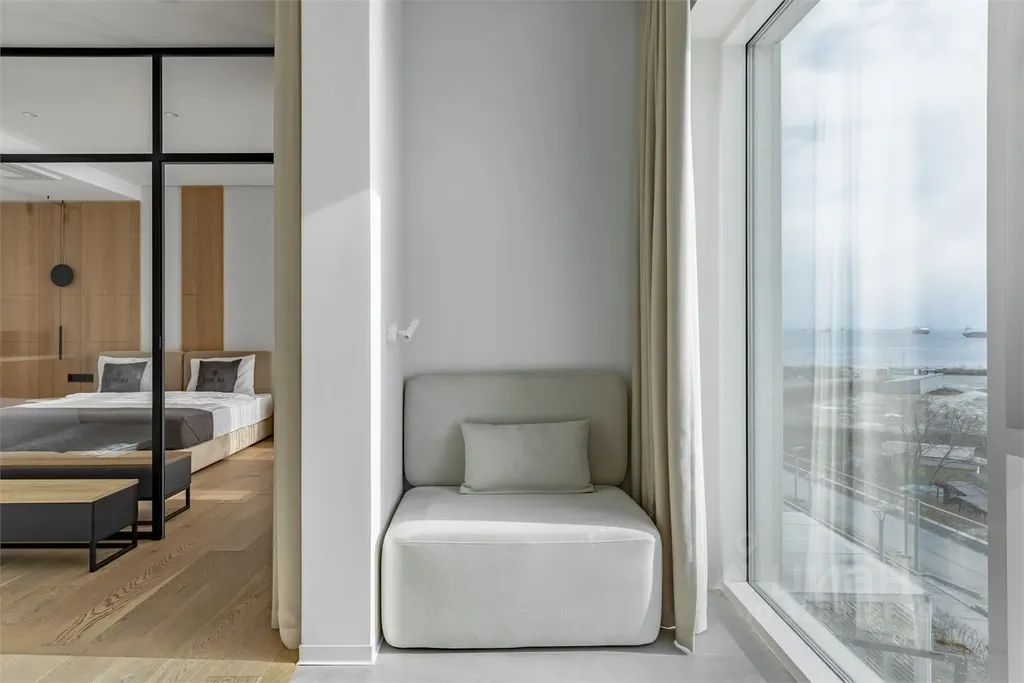 Номер категории люкс с видом на море. Состоит из двух комнат, зона отдыха от спальной зоны отделена стеклянной перегородкой. В номере есть кондиционер. телевизор, чайник, холодильник с мини-баром, собственная ванная комната.