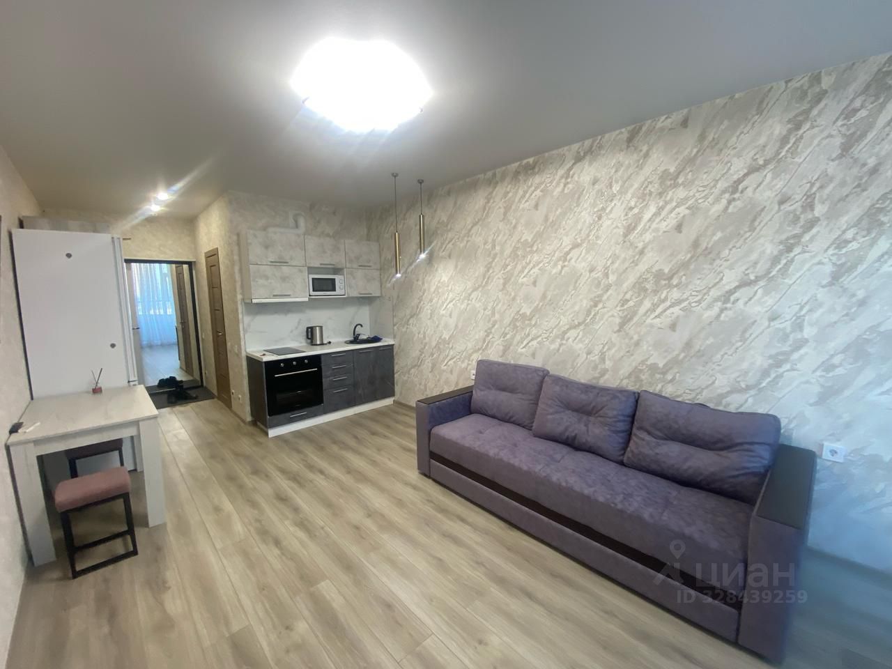 Студия полностью готова для проживания. В квартире выполнен современный ремонт, установлена удобная мебель как в комнате, так и на кухне. Из бытовой техники есть всё необходимое: холодильник, телевизор, стиральная машина и кондиционер. Планировка открытого типа создает ощущение простора, а наличие интернета позволит вам всегда оставаться на связи.