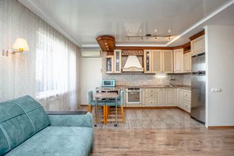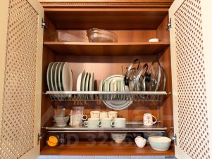 - Полностью оборудованная кухня: плита, вытяжка, посуда