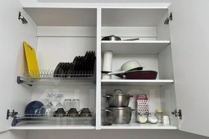 кухня с посудой, плитой, холодильником, чайником