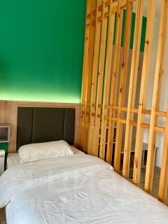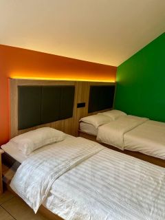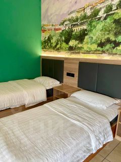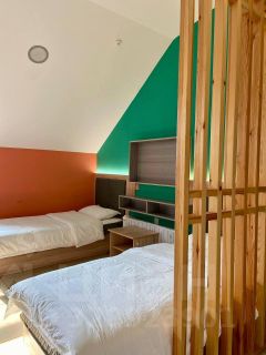 В наличии есть два номера с 1 двуспальной и с тремя односпальными кроватями. Номера оборудованы кондиционером, спутниковым ТВ, холодильником, сейфом, рабочей зоной и собственным санузлом с душевыми принадлежностями. В одном номере две душевой кабины, в в другом 1 душевая кабина. При бронировании можете указать в каком номере хотите жить. Дизайн каждого номера уникален.