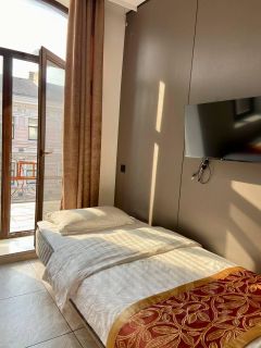 В наличии есть номера с тремя односпальными кроватями, с окном и с балконом. Из окна открывается вид частично на море, мост Золотой Рог, красивую церковь, здание администрации Приморского края и многое другое. Номера оборудованы кондиционером, спутниковым ТВ, холодильником, сейфом, рабочей зоной и собственным санузлом с душевыми принадлежностями. На балконе можете провести фотосессии с красивым видом. Дизайн каждого номера уникален.
