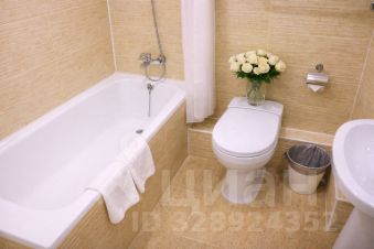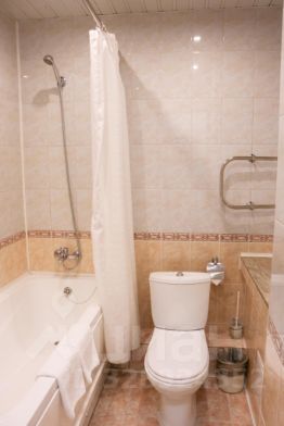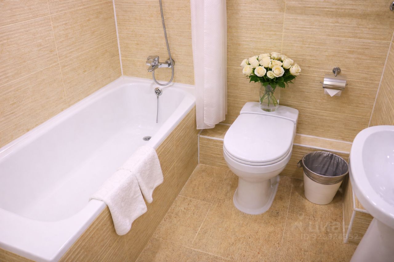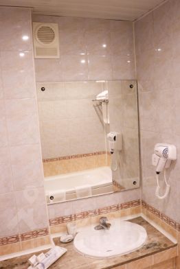 Ванная комната оборудована ванной и душем, феном.