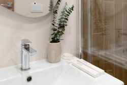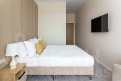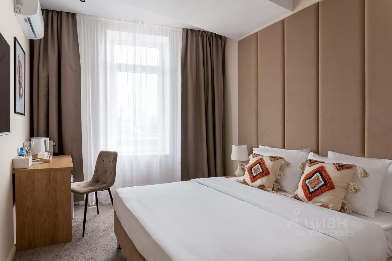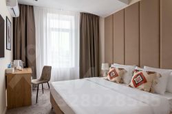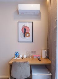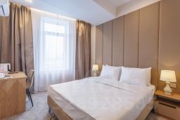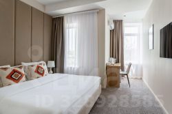 В номере: двуспальная кровать, прикроватные тумбочки, шкаф, телевизор, рабочий стол, холодильник, сейф, кондиционер, балкон, капсульная кофемашина, чайник, чайные принадлежности, душ, теплый пол в ванной, косметические принадлежности, вафельный халат, фен.
