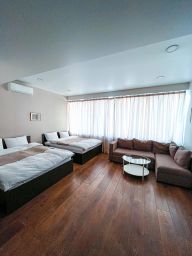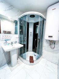 Семейный номер с двумя двуспальными кроватями и диваном. В номере есть тв, собственный сан.узел, душевая кабина, тапочки, халаты, вода.