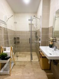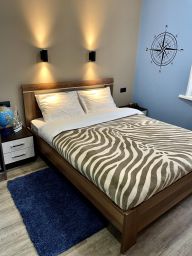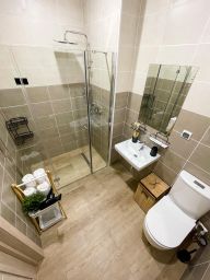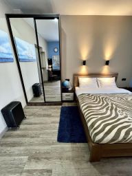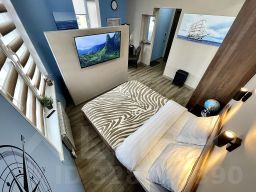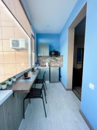 Семейный номер люкс с 1 двуспальной и 1 односпальной кроватью с балконом с видом на море. В номере телевизор, холодильник, ванная комната.