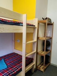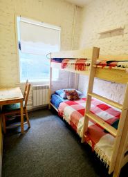 Наполнение комнаты: двухъярусная кровать (90 см одно спальное место), полотенца, стеллаж, стол, стул, зеркало, вешалка для одежды, вентилятор, беруши.