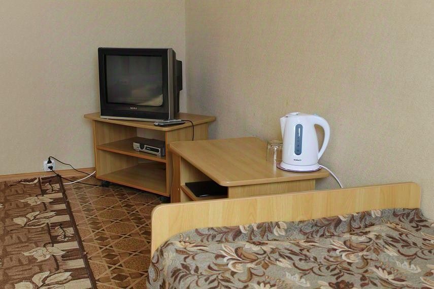 2 кровати, 2 тумбочки, столик, 2 стула, телевизор, кабельное ТВ, шкаф-купе, сан. узел и душевая кабина на два номера.