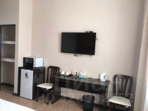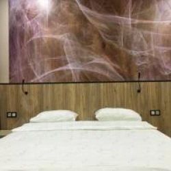 В номере одна большая кровать(евро), телевизор, холодильник, стол, стулья, удобства (душ и туалет) в номере.