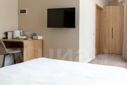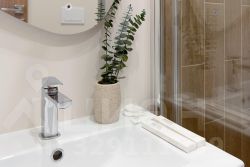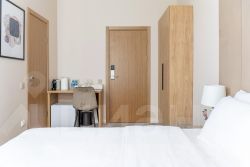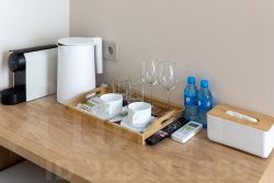 В номере: двуспальная кровать, прикроватные тумбочки, шкаф, телевизор, рабочий стол, холодильник, сейф, кондиционер, балкон, капсульная кофемашина, чайник, чайные принадлежности, душ, теплый пол в ванной, косметические принадлежности, вафельный халат, фен.