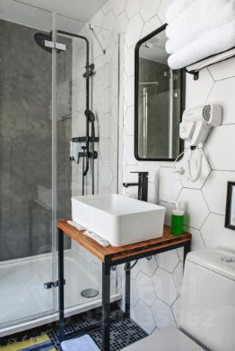 В ванной комнате: туалетно-косметические принадлежности, туалет, ванна или душ, полотенца, тапочки, фен, туалетная бумага.
