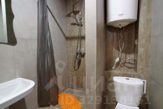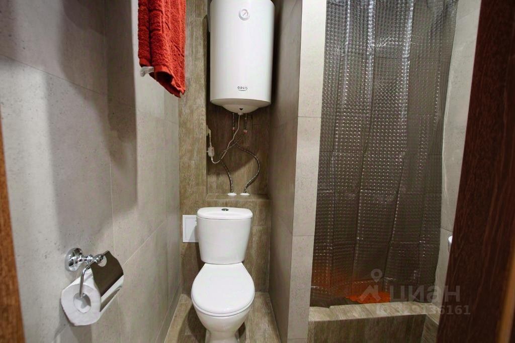 В ванной комнате: туалет, душевая кабина, раковина, зеркало.