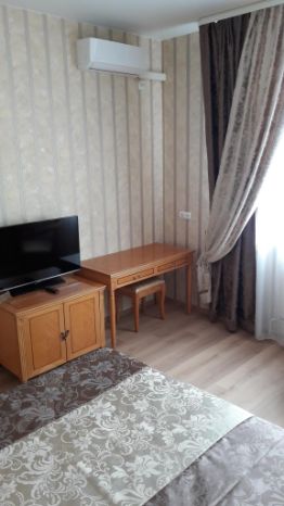 - спальную с одной широкой кроватью с двумя прикроватными тумбочками, тумбой под телевизор, рабочим столом, кондиционером, индивидуальным сейфом;