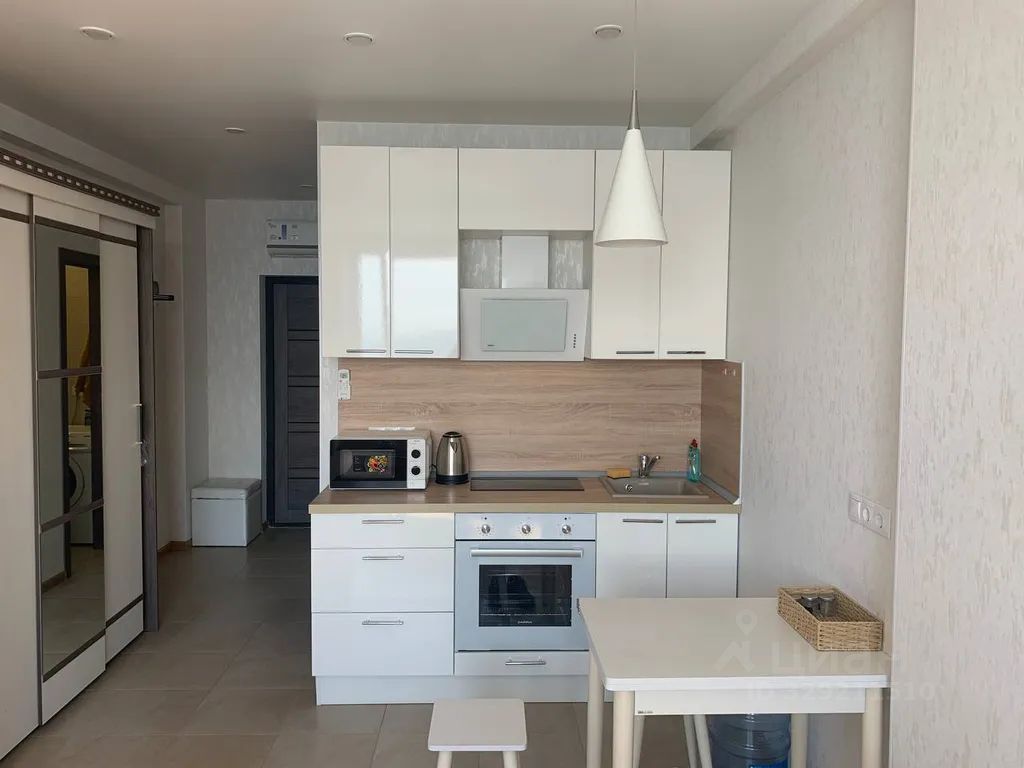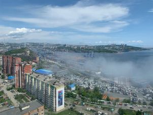 Квартира располагается в хорошем районе. Рядом находится много магазинов, пляж, два торговых центра. С окна город как на ладони. Видно два моста, порт и центр.